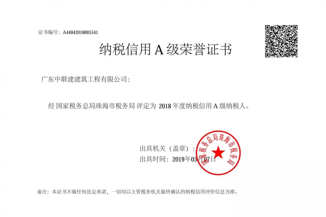 近日,国家税务总局珠海市税务局网站公布了《2018年度纳税信用A级纳税人名单》,中联建集团旗下澳门新京葡app获评2018年度“纳税信用A级纳税人”荣誉称号。目前,公司已连续两年获此荣誉。